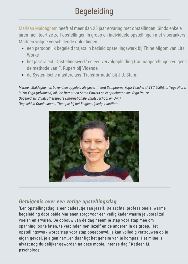 Yoga, yoga weekend, yoga retreat, opstellingen, craniosacraal, familieopstellingen,Shiatsu, bosbaden, meditatie, Grimbergen, Meise, Koekelberg, Yoga Pauze, yoga lessen, weekend, vakanties, yoga voor bedrijven, shiatsu, Marleen Maldeghem